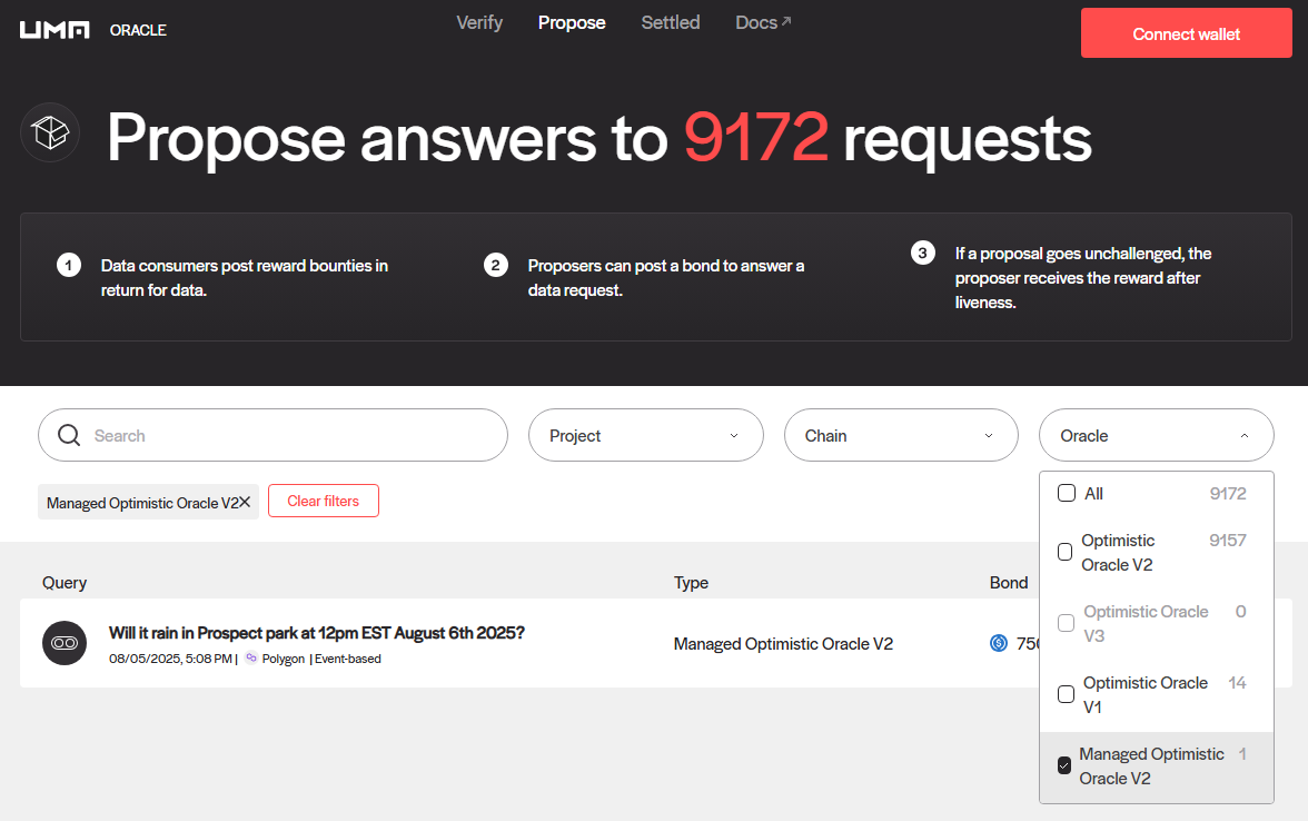 * ManagedOptimisticOracleV2 requests are tagged "Managed Optimistic Oracle V2" on the Oracle Dapp.&#x20;